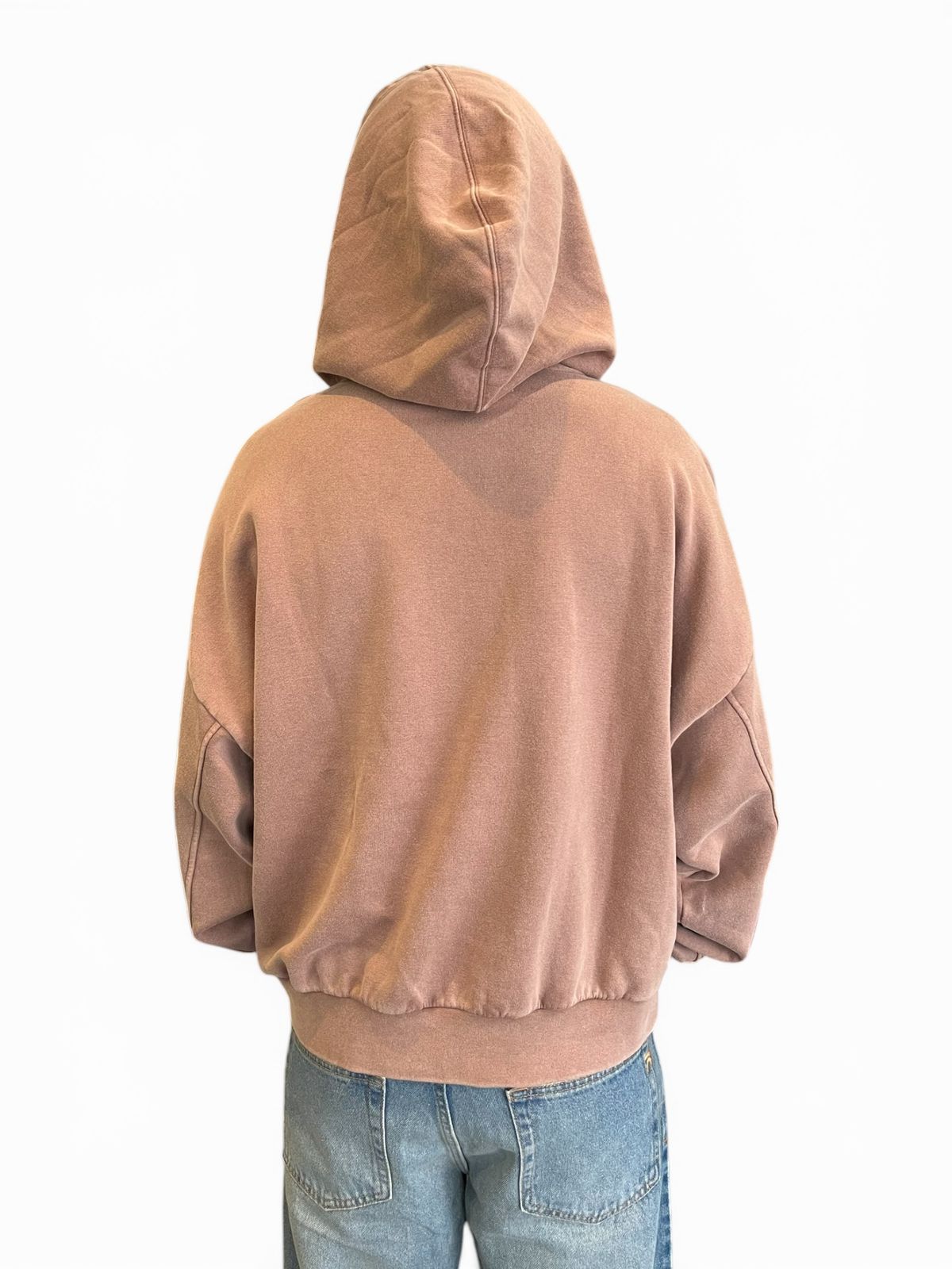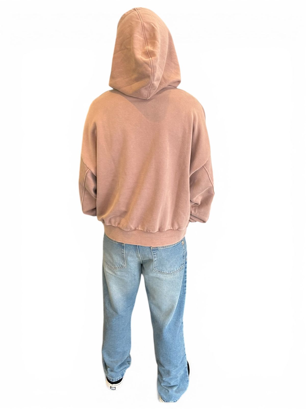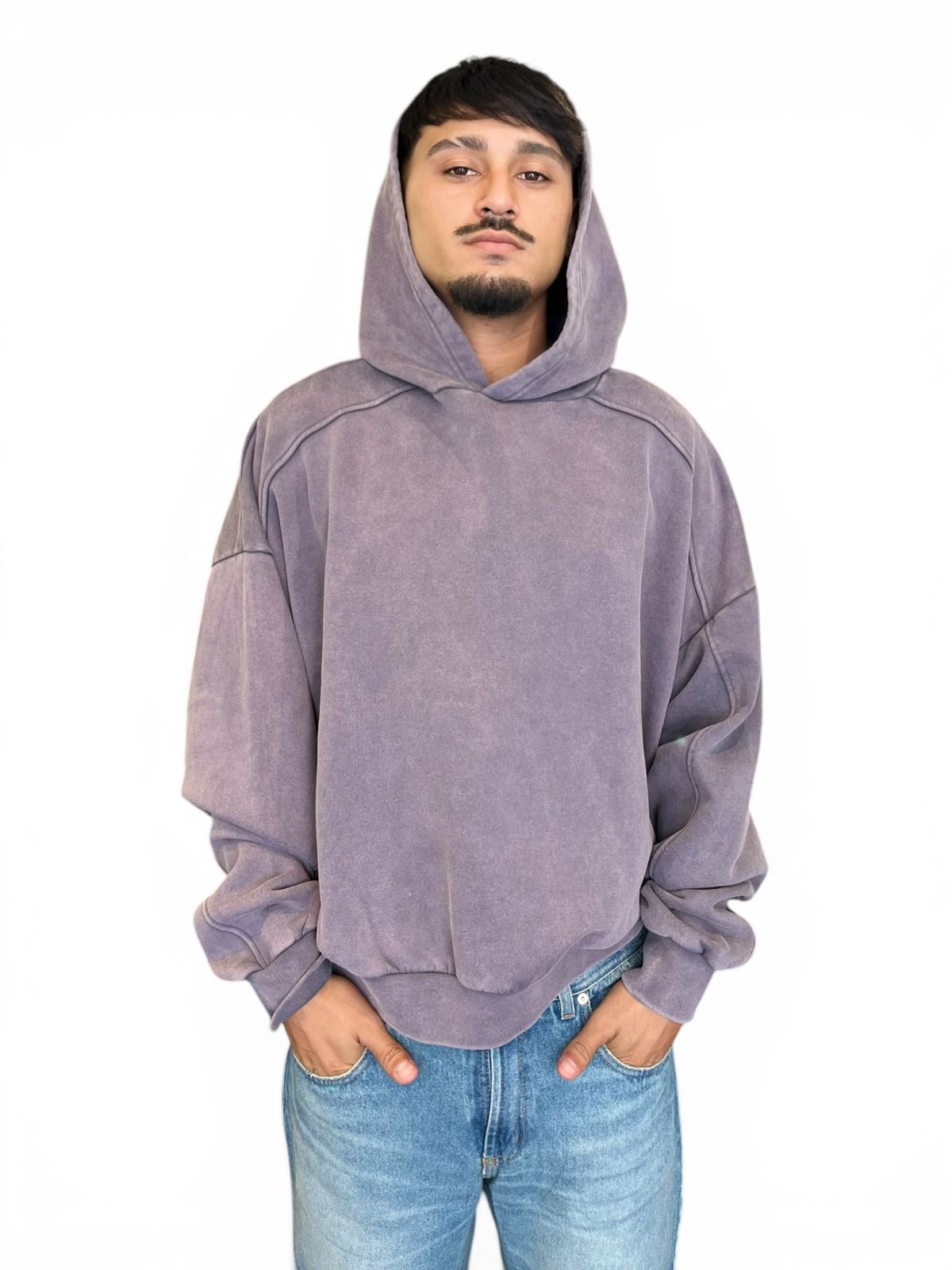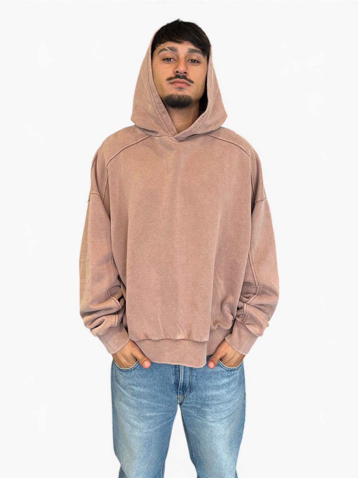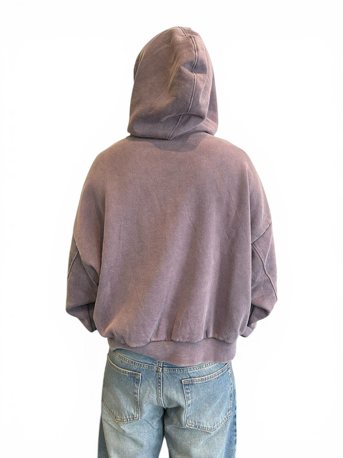 Buzo de algodón con frisa. Con proceso de prelavado, lo que le da el toque gastado al color. Corte boxy, con mangas bien anchas y capucha amplia.