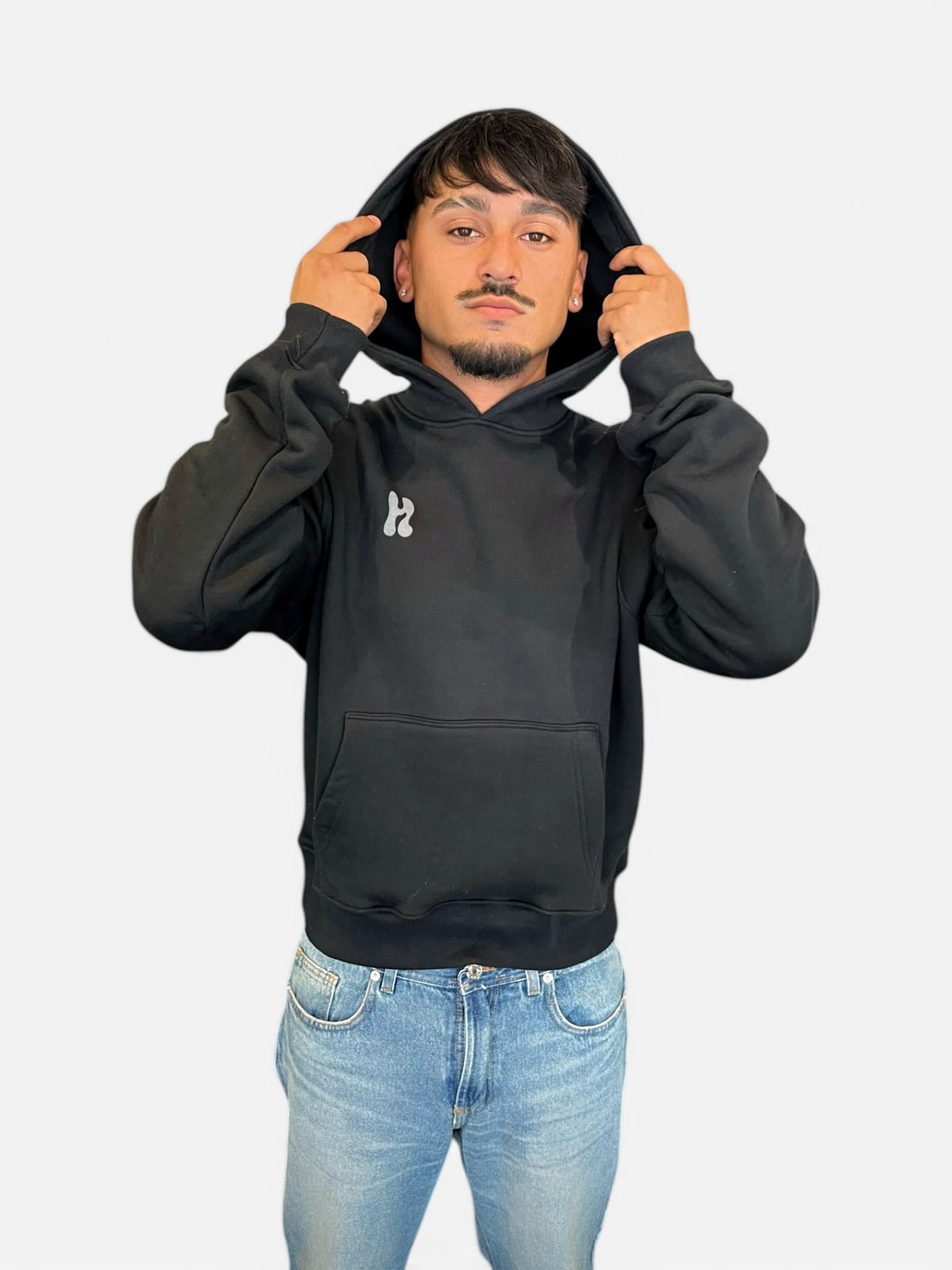 Buzode algodón frisado tipo canguro, con bolsillo y capucha amplia. Corte boxy, mangas clásicas. Con puños y pretina ribb. Estampado pequeño al frente y mas grande en la espalda.