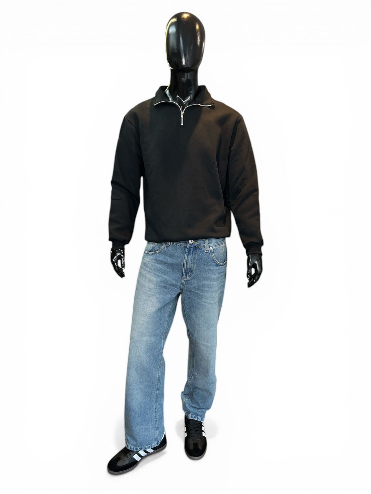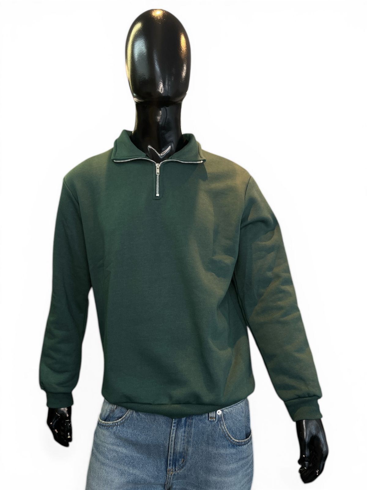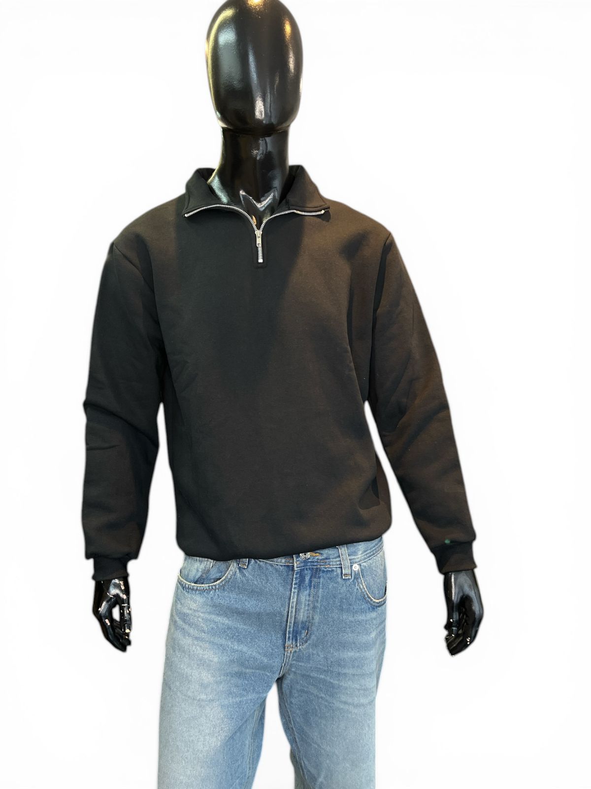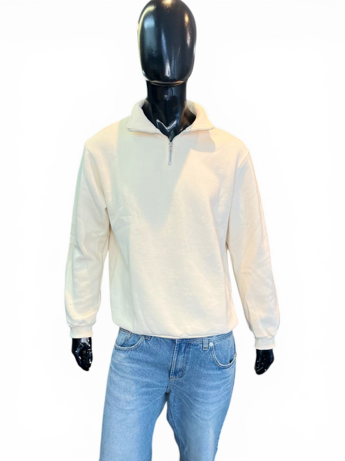 Confeccionado en algodón frisado y puños rib. Cuello alto, medio cierre.