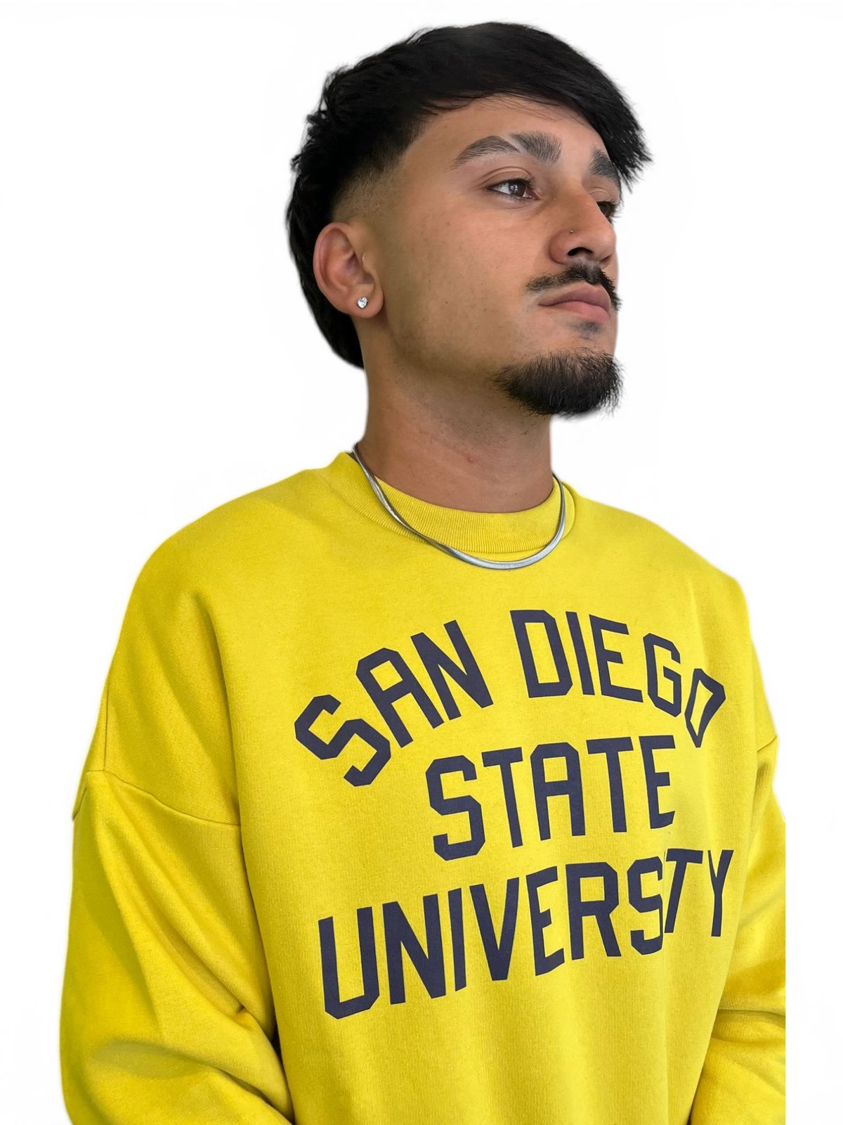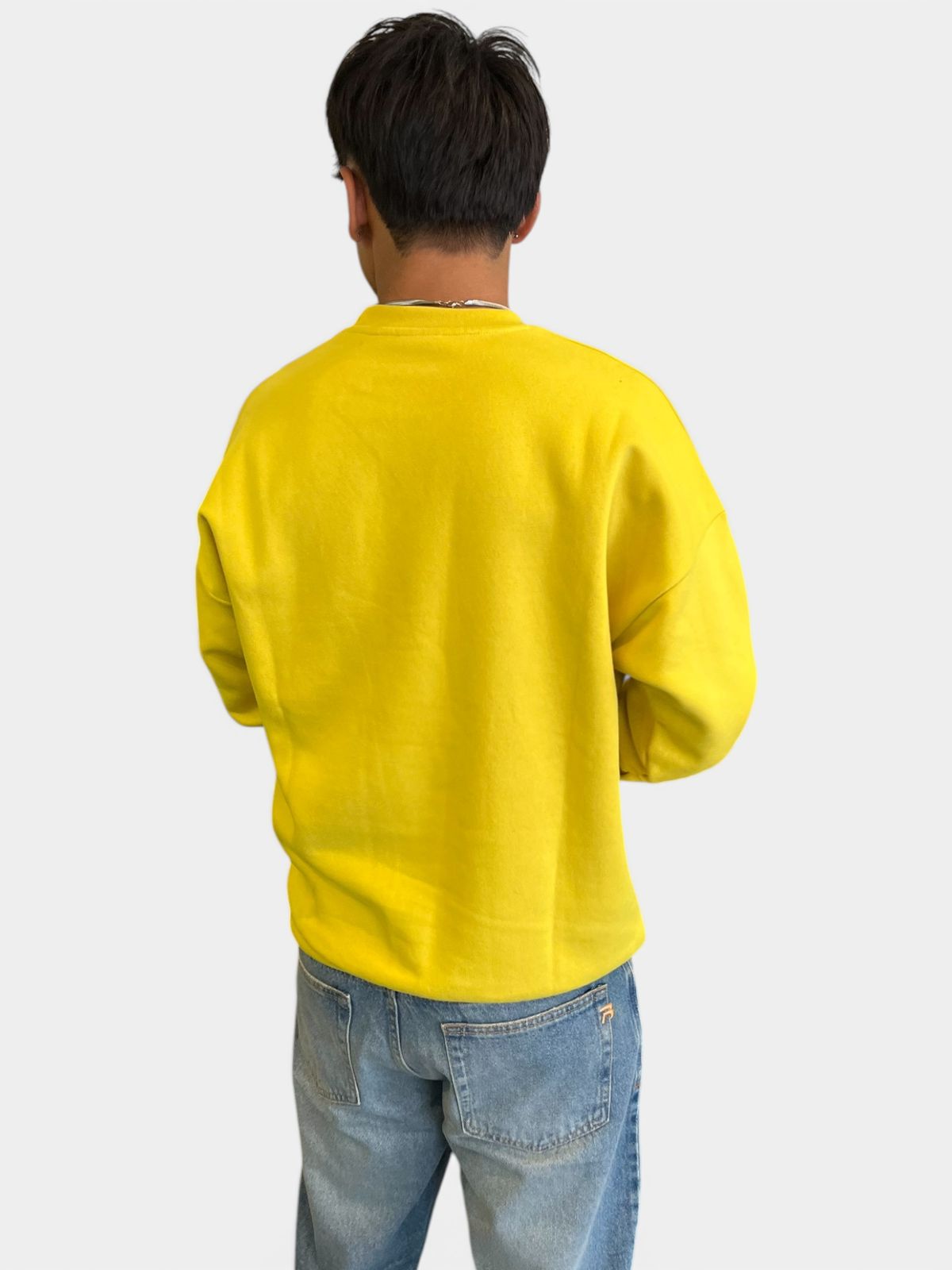 Buzo cuello redondo, de algón frisado. De corte regular. Con cuello, puños y pretina de ribb. Estampado al frente.