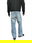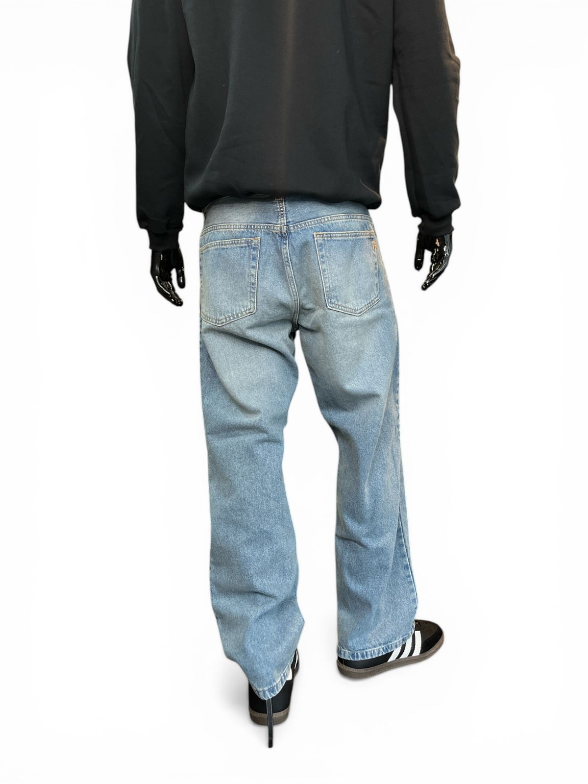 Confexionado en tela de jean rígida, corte recto. Color celeste gastado con un tono oxido suave.