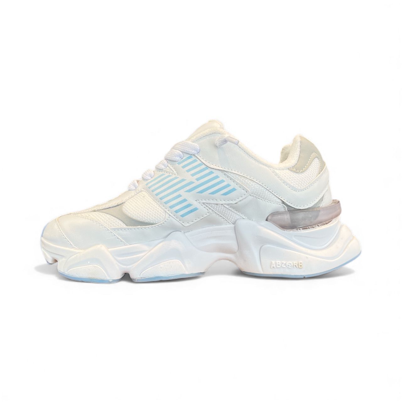 La parte superior combina cuero sintético y malla, en colores blanco, celeste y gris claro.