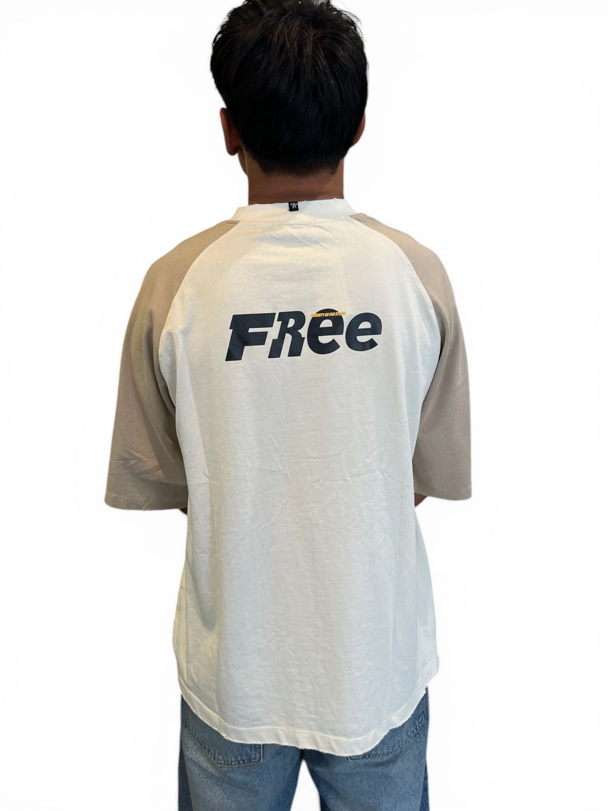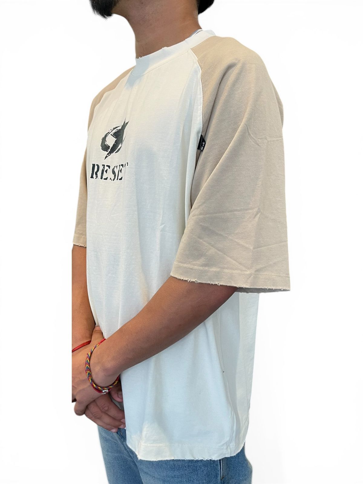 Remera de algodón oversize, manga ranglan combinada. Con efecto gastado en los bordes (cuello, mangas y cadera).