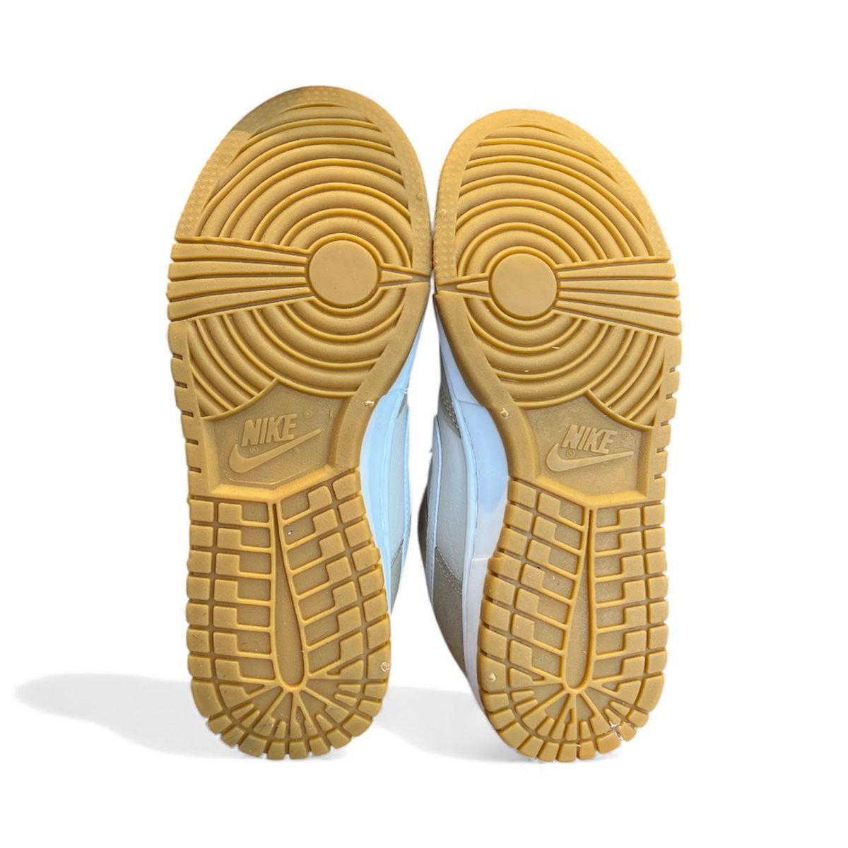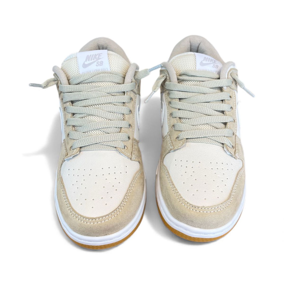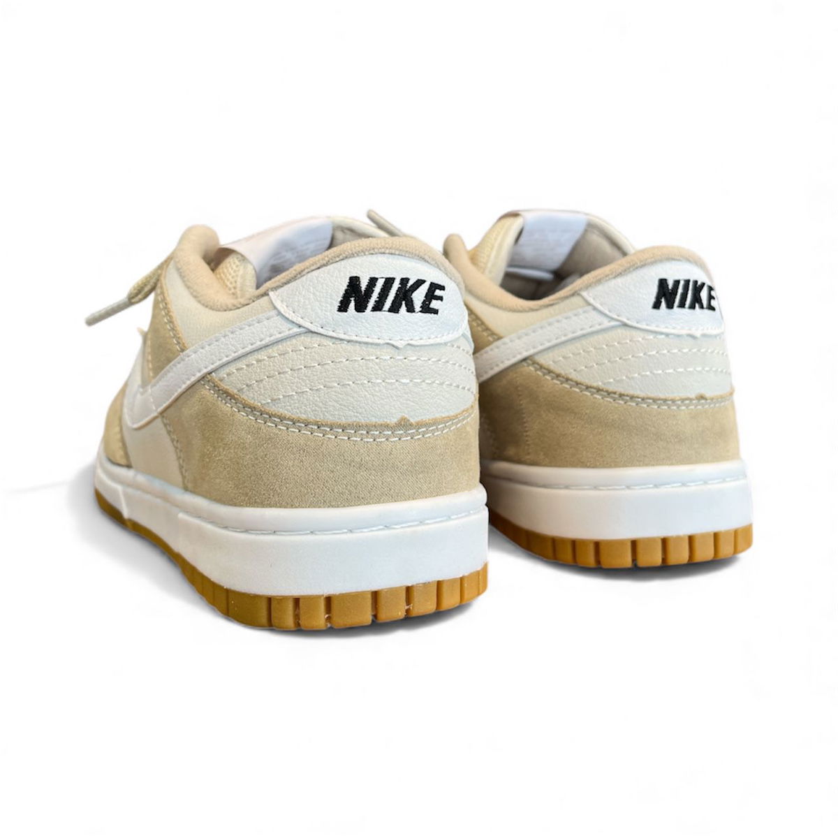 La capellada o parte superior está confeccionada en una combinación entre cuero sintético y gamuza en tonos natural y beige. Con el logotipo Swoosh en blanco y posee bordado en la parte trasera sobre el talón en negro NIKE. La suela es de goma resistente en tonos natural y maíz. Trae cordones beige y blancos para intercambiar a gusto.