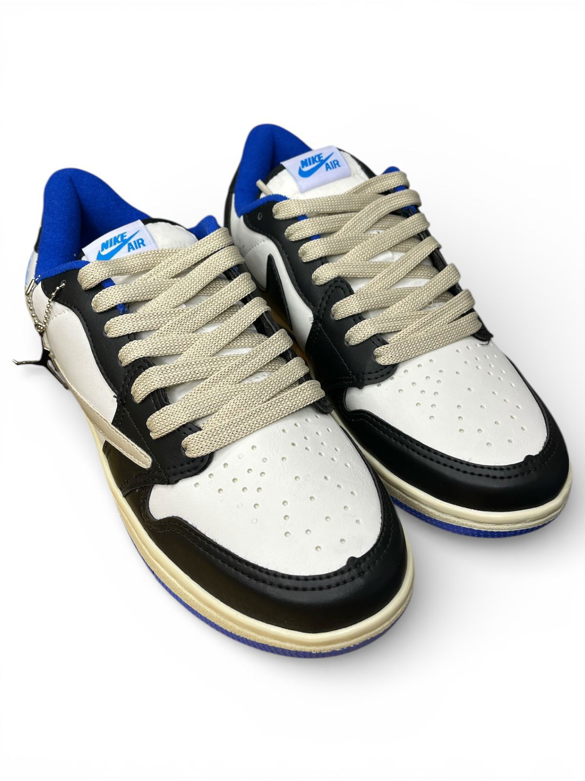 Esta zapatilla es conocida por su diseño único: logotipo de Nike (Swoosh) girado y orientado hacia atrás en el lateral. Con una combinación de colores azul, blanco, natural y negro, y su suela bicolor azul y natural. Posee dos pares de cordones, un par en natural y otro en color azul eléctrico.